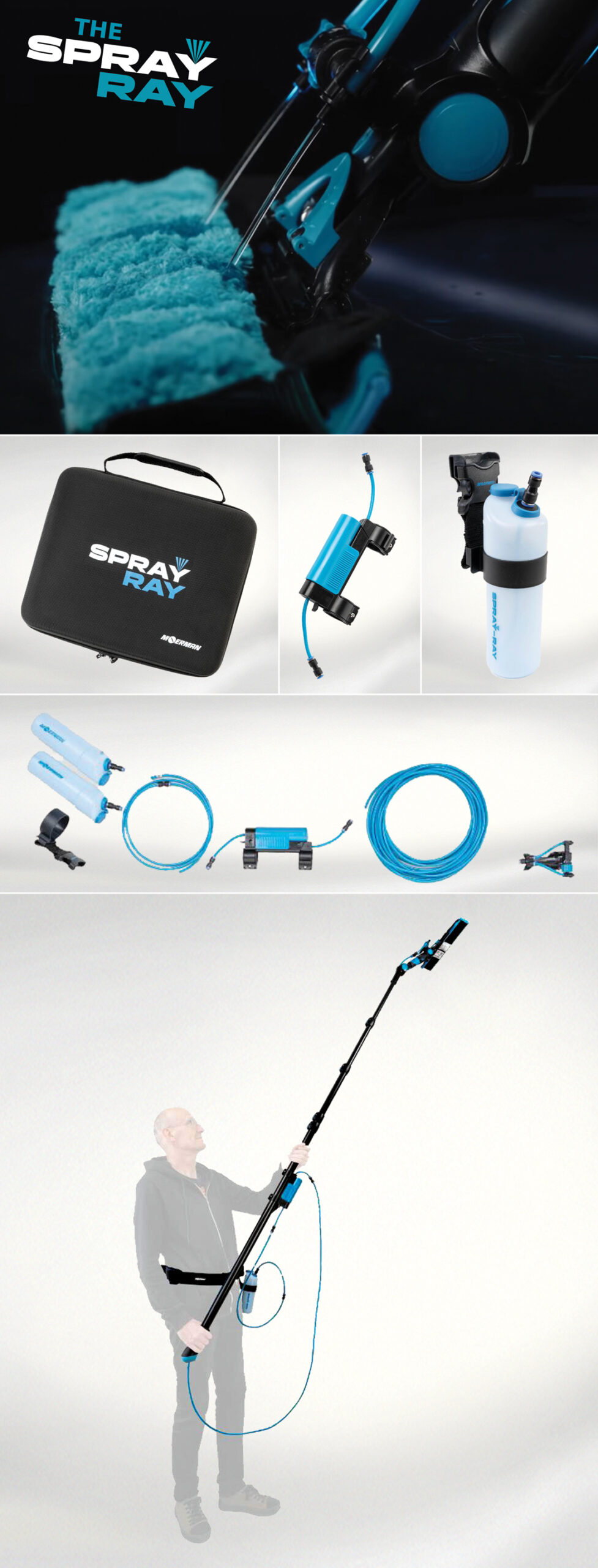 Spray-Ray is het nieuwste spuitsysteem van Moerman, eenvoudig je inwasser nat maken op hoogte. Deze kan rechtstreeks op de Moerman Excelerator 2.0-handgreep of Moerman Gekko-padhouder worden bevestigd. Voordeel: nooit meer een te droge inwasser vanwege de bevochtiging van de F*LIQ of Gekko pad, waardoor morsen en nadruppelen wordt voorkomen. De spuitfles kan aan een riem bevestigd worden. De fles heeft een inhoud van 500 ml, hiermee kan men per fles 20 tot 25 keer sprayen. Werkt zonder batterijen. De Moerman Spray-Ray Set zit in stevige draagtas.